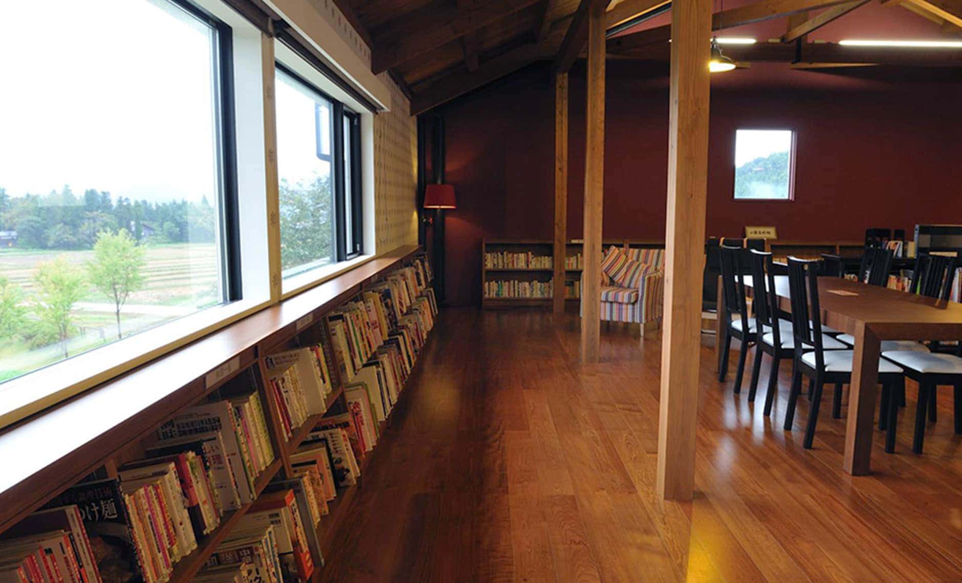 「つつみや八蔵」に隣接する建物の2階が「八蔵資料館」。世界の酒と食に関する書籍3,000冊ほどを揃えたミニ図書館です。 重厚な扉を開けて2階へ上がると、驚くほどの静けさ。 大きな窓からは長森の里山を一望することができます。